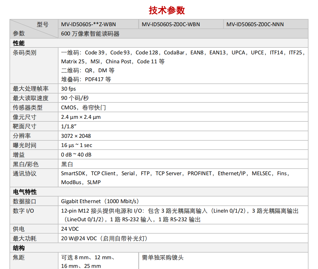 MV-ID5060S-Z-型号智能读码器,提供多种镜头接口,可高速读取多种码制的一维码和二维码,读取速度最大可达90个码/秒。同时采用自研的深度学习算法,鲁棒性强,可识别多种复杂条码。