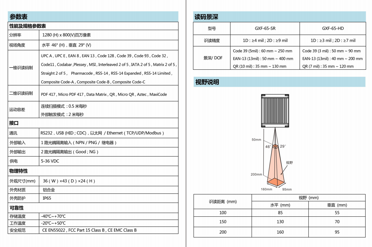 核心性能:搭载 1280×800 像素图像传感器,搭配 MEXXEN 第三代解码技术,能识别多种一维码和二维码,还可应对低对比度、污损、扭曲的条码。它有 GXF - 65 - SR 和 GXF - 65 - HD 两个型号,前者适配常规条码识别,后者识别精度更高,1D 精度可达≥3mil、2D 精度≥7mil。此外它以 60FPS 帧率工作,配合水平 46°、垂直 29° 视角的镜头,能满足低速运动场景下的点对点读码需求。实用设计:机身仅 36×38×24mm,重约 85g,设计紧凑易于安装。机身采用高强度金属材质,防护等级达 IP65,能防尘且抵御低压淡水喷溅;配备蜂鸣器和 LED 指示灯,可直观提示扫码状态,还支持 RS - 232、USB 等多种通讯接口,适配不同设备连接需求。